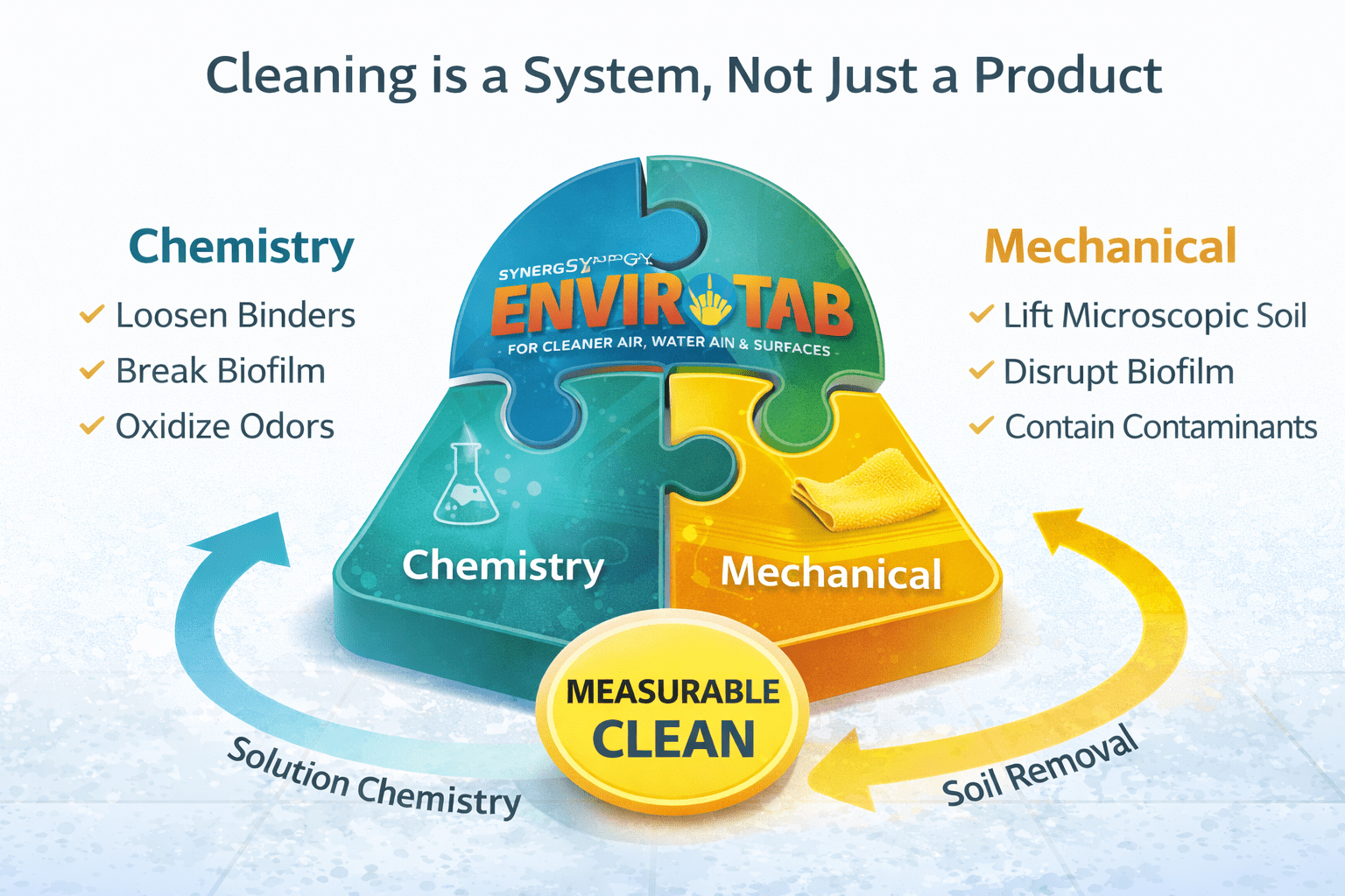 Envirotab is not a stand-alone “spray and pray” disinfectant. It was designed to function as part of a complete cleaning system that prioritizes:
